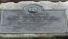 The bronze sculpture depicts William III of England in Roman attire mounted on a horse.[1] It is said that the tail of the Glasgow statue is designed to move to prevent it being broken by means of a ball and socket joint.[2] In front of the plinth is a plaque that reads "In commemoration of the Tercentenary of the Glorious Revolution of 1688-89". The statue is a A listed building.[3]