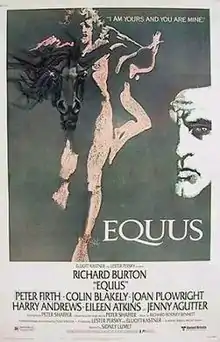 Equus is a 1977 psychological drama film directed by Sidney Lumet and written by Peter Shaffer, based on his play of the same name. The film stars Richard Burton, Peter Firth, Colin Blakely, Joan Plowright, Eileen Atkins, and Jenny Agutter. The story concerns a psychiatrist treating a teenager who has blinded horses in a stable, attempting to find the root of his horse worship.