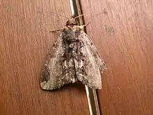 The adult moth of this species is grey or brown, with two large black patches on each forewing: one at the base and one at the wing tip. The hindwings are darker, and each has a large central white spot.[2]