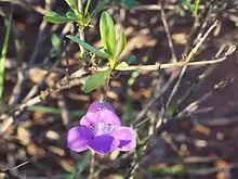 The flowers are usually borne singly in leaf axils on an S-shaped stalk, usually 10–20 mm (0.4–0.8 in) long. There are 5 overlapping, green, lance-shaped, sepals which are mostly 2.5–6.5 mm (0.1–0.3 in) long. The petals are 11–24 mm (0.4–0.9 in) long and are joined at their lower end to form a tube. The petal tube is deep lilac to purple on the outside and white with dark purple spots on the inside. The outside of the petal tube is hairy, but the inside surface of the lobes is glabrous while the inside of the tube is filled with woolly hairs. The 4 stamens are fully enclosed in the petal tube. Flowering occurs from March to October and the fruits which follow are oval to almost spherical, dry with a hairy, papery covering and are about 5–7 mm (0.2–0.3 in) long.[2][3]
