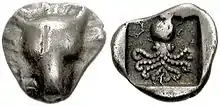 The temple of Apollo Daphnephoros is the most important and wider known monument of Eretria, featuring sparkling and sharp sculptures on the pediments, their postures well in advance of experiments in Athens of the time.[11] Together with its enclosure it constituted the sacred temenos of Apollo, a religious centre and fundamental place of worship within the core of the ancient city, to the north of the Agora.