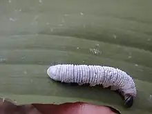 Erionota thrax caterpillar on a banana leaf (Musa sp.), Maui, Hawaii