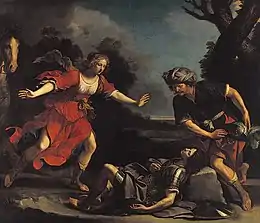 The story of Erminia borrows its argument from Jerusalem Delivered by Torquato Tasso (1575, Canto VII: Pastoral Care of Erminia). The action takes place in the countryside of Soria, on the banks of the Jordan River. Erminia, a Muslim princess, betrays her city for love of the invading Christian knight, Tancredi. But this one is in love with Clorinda. Erminia, jealous, disguises herself with Clorinda's armor in search of her lover.[6]