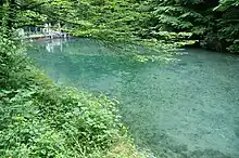 The spring known as "Ermsursprung" is located just under one kilometre (0.62 mi) southeast of the village Seeburg in the Mühltal. The average flow rate of the karst spring is between 335 L/s (11.8 cu ft/s)[2] and 380 L/s (13 cu ft/s)[1] (this corresponds to 20.1 m³ or 22.8 m³ per minute). Depending on the weather, the source discharge fluctuates between 67 and 1,000 L/s (2.4 and 35.3 cu ft/s).[2]