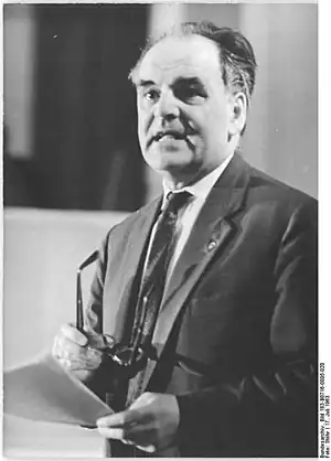 Further appointments at the vital interface between the academic and political worlds followed. In 1960 the (East) German Academy of Sciences appointed him as Director of its Institute for German History in succession to Karl Obermann.[1] From 1969 till his retirement in 1974 he headed up the restructuring of the Academy's so-called "Research Centre for Methodology and then History of History Sciences" ("Forschungsstelle für Methodologie und Geschichte der Geschichtswissenschaft"). During this time he developed and promulgated his "Education Theory" ("Formationstheorie").[13] Between 1960 and 1980 Ernst Engelberg served as President of the National Committee of East German Historians ("Nationalkomitee der Historiker der DDR").[1]