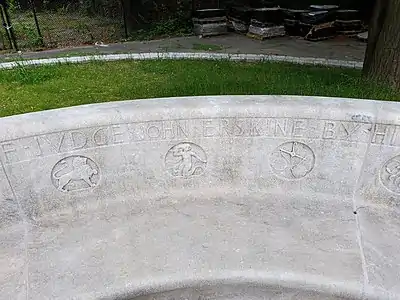 The fountain was built to honor John Erskine, a Federal judge from Atlanta who died in 1895.[1] The fountain, which cost $15,000 to build, was a gift from Erskine's daughter to the city of Atlanta and was dedicated by Mayor Porter King on May 2, 1896.[2] It was the first public fountain in Atlanta.[3] The fountain was originally placed at what is now Hardy Ivy Park, at the diversion of Peachtree Street and West Peachtree Street.[2] The fountain replaced a statue of Benjamin Harvey Hill,[4] which was moved from the location to the Georgia State Capitol, where it still stands.[1] The fountain and accompanying bench were designed by J. Massey Rhind and feature an ocean theme, along with inscriptions of the Zodiac signs.[1] The lower bowl of the fountain originally had bronze cups attached with chains to allow people to drink from it, though these have since been removed.[2]