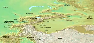 When Uwais Khan was killed in 1428 the Moghuls were thrown into a state of confusion. Some of them supported Esen Buqa, while others supported his older brother, Yunus Khan. The party of Yunus Khan, however, found themselves a minority and fled to the Timurid Ulugh Beg.