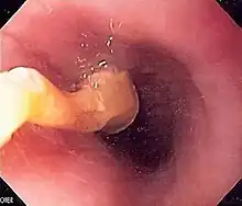 The standard treatment of food bolus obstruction is the use of endoscopy or fibre-optic cameras inserted by mouth into the esophagus.[6] Endoscopes can be used to diagnose the cause of the food bolus obstruction, as well as to remove the obstruction. Traditional endoscopic techniques involved the use of an overtube, a plastic tube inserted into the esophagus prior to the removal of the food bolus, in order to reduce the risk of aspiration into the lungs at the time of endoscopy.[8] However, the "push technique", which involves insufflating air into the esophagus, and gently pushing the bolus toward the stomach instead, has emerged as a common and safe way of removing the obstruction.[8][19]