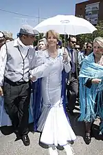 Esperanza Aguirre self-defines as a "liberal".[29] Known by her professed anglophilia,[30] she has cited her admiration for the figure of Margaret Thatcher.[31] According to Jorge del Palacio, Aguirre aimed to develop a Spanish version of the uneasy union between conservatism and the liberalism inspired by Friederich Hayek.[32] She has often been regarded as a leading figure of the most conservative wing of the PP,[33][34] and, having reportedly held political differences and an uneasy personal relationship with PP's leader Mariano Rajoy, she personally asked the latter for a change in the leadership of the party before the June 2016 general election.[35][36]