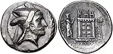 "Istakhr" (also spelled Estakhr) is the New Persian form of the Middle Persian Stakhr (also spelled Staxr), and is believed to mean "strong(hold)".[1] According to the Iranologist Ernst Herzfeld, who based his arguments on coins of the Persian Frataraka governors and Kings of Persis, the Middle Persian word in turn derives from Old Persian *Parsa-staxra ("stronghold of Pars"), owing to the city's close connections with the nearby Persepolis platform.[1][lower-alpha 1] Herzfeld interpreted the Aramaic characters "PR BR" inscribed on these coins as an abbreviation of Aramaic prsʾ byrtʾ ("the Fortress of Parsa"), which in turn may be the equivalent of the aforementioned Old Persian words.[1] The abbreviation "ST", denoting Istakhr, also appears on Sasanian coins.[2] Istakhr is attested in Syriac as Istahr and in Armenian as Stahr.[2] It probably appears in the Talmud as Istahar.[2]