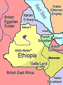 In early 1895, the Italians received report that French agents encouraging protection for Menelik, and the Italian increasingly became involved in Ethiopia and suspected England under which the secret scheme existed between France and Russia, while the French occupies Harar, the British did not express resentment.[8] In 1897, the first Anglo-Ethiopian treaty was signed by British diplomat Rennell Rodd of the United Kingdom of Great Britain and Ireland and Menelik in the issue of border between British Somaliland and lesser the border formed after Battle of Adwa. It was not demarcated until 1932, when Ras Tafari Mekonnen visited Europe in 1924 to demarcate all the Ethiopian borders.[9]