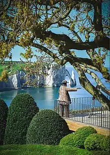 Thébault was friends with French painter Claude Monet, who regularly came to the gardens to paint.[9] Inspired by the Étretat cliffs, Monet created his painting series Les Falaises à Étretat, whilst inspiring Thébault to create an avant-garde garden at the clifftop.[10] A vine sculpture on the terrace of the garden pays tribute to Monet's influence.[9] It depicts the painter working on his "Coucher de soleil à Etretat" painting.[11]