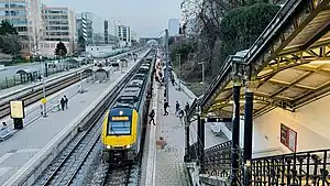 Etterbeek railway station (French: Gare d'Etterbeek, Dutch: Station Etterbeek)[lower-alpha 1] is a railway station in Brussels, Belgium, operated by the National Railway Company of Belgium (NMBS/SNCB). The station is named after the municipality of Etterbeek, though it is located in neighbouring Ixelles, at the Couronne/Kroon crossroad on the Greater Ring. It first opened in 1880, and was, as of 2007, the 29th most used railway station in Belgium, with 5,565 passengers per day.[1] In 2014, the station was used by 4,766 passengers on weekdays.