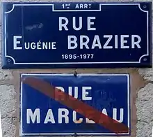 In France, Brazier was not forgotten. Her recipe book, published in 1977, went into a second edition in 1992 and a third in 2001.[67] In 2003 the neighbouring street closest to the restaurant at 12 rue Royale was renamed rue Eugénie-Brazier by the Lyon City Council.[1]