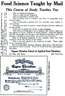 Christian was the owner of the "Christian Natural Food Company", he also operated a mail-order school, the Eugene Christian School of Applied Food Chemistry.[8] He charged $100 for a diploma course in which a F. S. D. degree (Doctor of Food Science) was awarded. The school faded and he formed the Christian Dietetic Society and School of Scientific Eating.[8] He sold a "Course in Scientific Eating" for $10. The organization merged into the Corrective Eating Society. The Society offered a course for $3 which promised to teach people how to cure disease by a dietetic system. The Society sold quack products such as the "Vaco Reducing Cup", that was alleged to remove fat.[8] His products were described as "pseudo-scientific buncombe" by the Bureau of Investigation of the American Medical Association.[15]