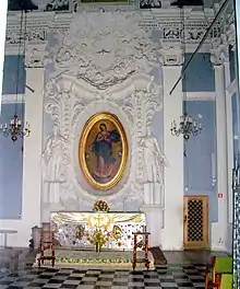 Wołłowicz organized three diocesan synods (1618, 1623, and 1626), but unlike his predecessor did not publish any of their decisions.[38] The Council of Trent required bishops to visit and inspect their dioceses at least every two years. There is no evidence that Wołłowicz visited churches in the Diocese of Vilnius other than the churches in Vilnius in 1618.[38] In a 1625 report to the pope, Wołłowicz claimed that made deaneries more active – deans visited their parishes every three months and called synods twice a year. He also claimed that in nine years that he became bishop, more than 40 Catholic churches were built in the diocese.[39] At least two churches were retaken from the Protestants, in Kėdainiai (1627) and in Deltuva (1628).[40] Overall, Wołłowicz was tolerant towards the Protestants and worked with Calvinist supporters Krzysztof Radziwiłł and Janusz Radziwiłł to find peaceful solutions and avoid violent clashes. For such policies, Wołłowicz even earned a nickname "heretic bishop".[41] He was also supportive of the Ruthenian Uniate Church which was established by the Union of Brest in 1595. He allowed the uniates to keep their liturgical calendar, participated in the first uniate synod in Kobryn, and was tasked to pursue beatification of Josaphat Kuntsevych who was murdered by an anti-union mob in 1623.[42] He was less tolerant towards Eastern Orthodoxs – he forbade the construction of the Orthodox Church of the Holy Spirit in Vilnius in 1625 and 1628 even though land for the church was donated by his relatives.[42]