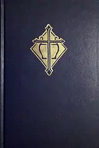 The cover of this hymnary is black with a gold imprinted logo on the front cover. The logo used is a Latin cross with budded arms superimposed over a lyre, on a diamond-shaped background. Inside these covers one finds more than hymn texts: The Church Year is summarized, followed by the full texts of the Augsburg Confession; the texts of the Apostles' Creed, the Nicene Creed, and the Athanasian Creed; and Martin Luther's Small Catechism . Prayers are included as well as four different rites of the Divine Service. The Divine Service: Rite One is based on the Danish Ritual of 1685; The Divine Service Rite Two is from the Common Service from 1888; The Divine Service: Rite Three is a new setting by Dr. Alfred Fremder; and The Divine Service: Rite Four is the Lutheran "Chorale Mass".[1] Other services included here are The Office of the Prime, Matins, Vespers, Compline, and others. A Service of Private Confession and Absolution is also included. Psalms, canticles, and other resources are also found here.