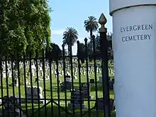 Evergreen Cemetery is a cemetery, crematorium and mausoleum located in Oakland, California, near the Eastmont Town Center and Mills College. The cemetery was established in 1903 and is located on a small hill, with a large combined mausoleum, crematorium and chapel at the top of the hill.[1] It is the second largest cemetery in Oakland, after the Mountain View Cemetery and Saint Mary Cemetery complex. It is full, and closed to new interments, but still operates a crematorium.