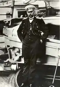 After returning as a teacher of the Helmsman's School on November 13, 1885, he was assigned to the gunboat Ermine and became the acting head of all arriving ships on February 28, 1887, but was transferred the Baltic Fleet within the 3rd Naval Crew on June 4, 1887.[2] From January 18 to March 29, 1888, he took classes on mines and became acting commander of the 6th Company of the training corvette Skobelev on April 29, 1888. In 1891, he was promoted to Captain 2nd Rank and commanded the transport Bakan in 1894 and later, the ship Slavyanka from 1894 to 1895 as well as command of the port of Kronstadt from 1895 to 1897. He was then commander of the Gilyak in 1897, commanded the training ships Voin from 1897 to 1901 and Okean from 1901 to 1904. After being promoted to Captain 1st Rank in 1901, he was given command of the Aurora and took the ship to participate in the Russo-Japanese War.[5] During the Battle of Tsushima, Egoriev was killed by fragments of a 75-mm projectile that exploded on the right gangway of the front bridge while he was at the conning tower.[6] The Aurora itself managed to survive the battle and the surviving crew buried him off the coast of the Philippines.[2]