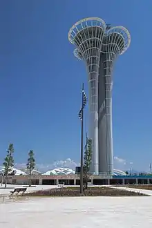 The Expo Tower (Turkish: Expo Kulesi) was designed by architects Serdar Kızıltaş and Zeynep Melike Atay. It has the form of a three-leaved peony that resembles the three-arched Hadrian's Gate (Turkish: Üçkapılar, literally: "The Three Gates"), a landmark of Antalya.[8]