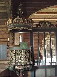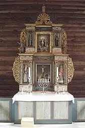In 1748, the church received exterior paneling, it was painted reddish brown with white window frames, and the roof was tarred. In 1810, a painting by the Fåberg artist Ole Larsen Smerud was gifted to the church. It is a painting of Jesus on the cross and it was hung above the altar in the church. Smerud studied painting in Copenhagen, where he worked as a court painter and heraldic artist.[7][8][4][6]
