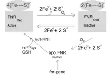 The functional state of FNR is determined by a (rapid) inactivation of FNR by O2, and a slow (constant) reactivation with glutathione as the reducing agent.[2]