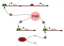 In Escherichia coli, the anaerobic expression of genes encoding the nitrate (narGHJI) and dimethyl sulphoxide (dmsABC) terminal reductases is stimulated by the global anaerobic regulator- FNR. The ability of FNR to activate transcription initiation has been proposed to be dependent on protein–protein interactions between RNA polymerase and two activating regions (AR) of FNR, FNR-AR1 and FNR-AR3. Also, in the presence of activated narL, the effect of FNR binding to the RNAP is decreased greatly.[11]