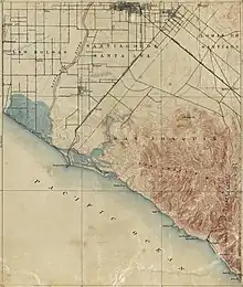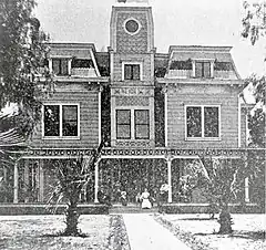 A 1907 advertisement promised a California Carlsbad located near "the famous celery fields", and offered what it claimed were "medicated celery peat mud baths".[7] Treatments were recommended for those who wished to recover in a "home-like atmosphere" from rheumatism, gout, or "blood disorders".[7] Access could be had by an hour-long ride from the Pacific Electric depot in downtown Los Angeles via the Newport Beach line, departures 9:10 a.m. and 3:10 p.m. daily.[7] In 1908, Mrs. G. S. Hiles bought the "GARDEN SPOT OF ORANGE COUNTY" from Mr. W. S. Collins and advertised, "Come out and take a plunge bath in the only mineral water of its kind in the world; 25¢ including suit and towels, either for ladies or gentlemen. Beautiful lawns and picnic grounds, tennis court and croquet grounds, all free to our guests. Special Sunday dinner 50¢. Sandwiches 10¢ Soda Water, Cigars and Cigarettes."[8] In February 1910, A.E. Hiles sold the hotel for $7,100 to Thomas Trythall of Santa Ana.[9] In December 1910 the hotel was sold again, to three men from Blackfoot, Iowa: James Mackie, J.E. Howard, and J. Bethel.[10] Circa 1912 the hotel advertised its cement "swimming plunge," which was 60 x 100 with depths ranging from 3 1/2 to 7 feet and had just been scrubbed out and filled with 96 °F (36 °C) mineral water.[11] According a tiny news item published, inexplicably, in 1965, "The 1918 earthquake destroyed the old Fairview Hot Springs Hotel where health seekers sought the cures of the hot sulphur springs."[12] This is probably a reference to the 6.7-Mw San Jacinto earthquake of April 21, 1918. On June 10, 1918, Cora Mackie, Fairview Hot Springs, advertised the sale of four bath tubs, a 100-gallon distillate tank, 100-gallon galvanized tank, and a number of pieces of farm equipment.[13] Other reports have it that Charles TeWinkle bought the building in 1920 and demolished it, or that it burned in a fire.[6]