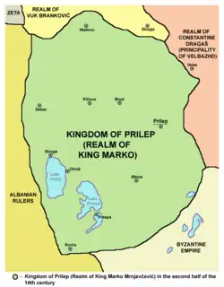 When his father died, "young king" Marko legally became a king and the co-ruler of Tsar Uroš. Soon afterwards came the end of the Nemanjić dynasty, when Uroš died on 2 or 4 December 1371, which formally made Marko the sovereign of the Serbian state. Serbian lords, however, did not even consider to recognize him as their supreme ruler,[3] and the separatism within the state increased even more.[4] After the demise of the two brothers and the destruction of their armies, the House of Mrnjavčević was left without any real power.[3] Lords surrounding Marko took the opportunity and seized significant parts of his patrimony. By 1372, Đurađ I Balšić grabbed Prizren and Peć, and Prince Lazar Hrebeljanović took Priština. By 1377 Vuk Branković acquired Skopje, and Albanian magnate Andrea Gropa became practically independent in Ohrid. The latter possibly remained a vassal to Marko as he had been to Vukašin.[4][5] Gropa's son-in-law was Marko's relative Ostoja Rajaković of the clan of Ugarčić from Travunia. He was one of the Serbian nobles from Zachlumia and Travunia (adjacent principalities in present-day Herzegovina) who had received lands in the newly conquered parts of Macedonia during Tsar Dušan's reign.[6]