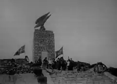 The invasion of Crete in May 1941 was the first major airborne assault in history. Despite their victory, the elite German paratroopers suffered such heavy losses that Adolf Hitler forbade further airborne operations of such large scale for the rest of the war. The memorial was erected at the end of a stone staircase leading to the top of a small hill. It consisted of a tall pedestal built from stone blocks, atop which stood a concrete diving eagle gripping a swastika in its talons.
