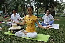 Outside mainland China, a network of volunteer "contact persons," regional Falun Dafa Associations and university clubs exists in approximately 70 countries.[25] In most mid- to large-sized cities, Falun Gong practitioners organize regular group meditation or study sessions in which they practice Falun Gong exercises and read (or re-read) Li Hongzhi's writings. The exercise and meditation sessions are described as informal groups of practitioners who gather in public parks—usually in the morning—for one to two hours.[13][18][26] Group study sessions typically take place in the evenings in private residences or university or high school classrooms, and are described by David Ownby as "the closest thing to a regular 'congregational experience'" that Falun Gong offers.[27] Individuals who are too busy, isolated, or who simply prefer solitude may elect to practice privately.[27]
