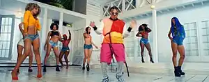 A screenshot from the music video, depicting Alejandro dancing with several female dancers in a party.