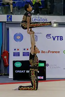 ![]() Farai Bright-Garamukanwa (top) and Kieran Whittle at the 2014 Acrobatic Gymnastics World Championships | |||||||||