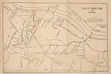 Vaux renamed the property "Vaux Hill." The 300-acre (121.4 hectares) farm spanned the middle of the peninsula.[4] Part of its western boundary, shared with Henry Pawling's farm, was the road south to Fatland Ford, a shallow crossing of the Schuylkill River, opposite Valley Forge.[5]
