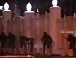 The final attempt in the coup attempt occurred 30 minutes later at Miraflores Palace where insurgents attempted to siege the palace and kill President Pérez.[15] Those attempting to attack Miraflores were told that the doors would be opened by the palace guards that were supposedly part of the coup.[15] However, when the attackers approached Miraflores in an armored vehicle, they were attacked by the palace guards who knew about the coup.[15] The firefight then ended Chávez's attack and left 3 of Pérez's bodyguards dead while Pérez hid under an overcoat eluding capture.[5][18] The president was then able to escape from the palace and then called General Ochoa saying, "No negotiations. Give them bullets. I want to be back in soon".[5][18] Pérez then used a local TV station to rally the rest of the military against his aggressors.[5] Chávez's allies were also unable to broadcast Chávez's pre-recorded call for a planned mass civilian uprising against Pérez.