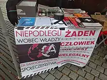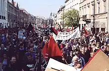 Anarchists from the FA took part in May Day demonstrations against Soviet Poland[26] and organized anti-tax rallies.[27] In the early 1990s in several Polish cities, FA protested against the introduction of religion to schools, and in front of the Sejm they led protests against the passing of the anti-abortion law.[28] In recent years, FA activists have been defending tenants as part of the campaign "Mieszkanie Prawem NIE Towarem" (Apartment [are a] Right, NOT a Commodity), by participating in eviction blockades.[29]