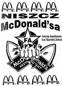 FA has organised protests against corporations, in particular McDonalds, and foreign governments, namely against the military intervention of the USA in Afghanistan and Iraq, and against Russia's 1994 invasion of Chechnya.[16] The Anarchist Federation has also protested against the G8 summits,[17] the European Economic Forum in Warsaw,[18] NATO,[19] the installation of the missile defence shield in Poland,[20] and the United Nations climate summit in Poznań in 2008.[21] Anarchists from the FA also participate in protests called "Food Not Bombs".[22]