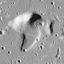 This feature is slightly elongated and oddly shaped, with a ridge on the northern side. This ridge is about as large around the base as Federov crater, and rises about 0.8 km above the surrounding lunar mare.