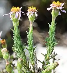Felicia canaliculata is a grayish green shrublet in the family Asteraceae that grows up to 40 cm (16 in) in height. It has narrow, awl-shaped leaves, relatively large flower heads with approximately a dozen light purple to white ray florets encircling many yellow disc florets. It can only be found in the Western Cape province of South Africa.[2]