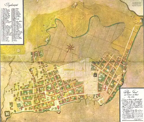Other Indian revolts occurred until July 1621, when in 1639 Bento Maciel Parente, sergeant major of the Cabo Norte Captaincy, invested in the village of the Tapajó Indians, decimating them and dominating the Conquista do Pará.[5][4] With the victory he was appointed Donatary captain of Grão-Pará, the Conquista was transformed into the then Captaincy of Grão-Pará (along with the creation of the State of Maranhão, with headquarters in São Luís),[13] and the settlement was elevated to the category of municipality with the name "Santa Maria de Belém do Pará" or "Nossa Senhora de Belém do Grão Pará" (later "Santa Maria de Belém do Grão Pará"),[14][4][2][15] when the first streets of the region were built, originating the historic district of Cidade Velha.[5]