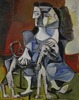 Femme au Chien (English: Woman with dog) is an oil-on-canvas painting by Pablo Picasso, which he painted in 1962. It is a portrait of Picasso's second wife, Jacqueline Roque, and their dog Kaboul, an Afghan Greyhound. The painting is an illustration of the great affection that Picasso displayed for both of the subjects in the portrait and has elements of the cubist style that he pioneered. It was produced in Picasso's later years when the couple was living at Notre-Dame-de-Vie, near Mougins, France. On 14 May 2019, it was sold at Sotheby's auction for almost $55 million and is now housed in the collection of Wynn Fine Art in Florida.
