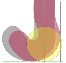 The extent of the stick head along the X+ axis, towards the 'heel' of the Head is confined by the rule requirement that the stick head and the handle meet in a smooth continuous fashion at the line C-C and by a rule restriction on the shape of the handle, which is that the stick-handle must not project beyond the line B1-B1. It is possible to envisage a stick where the width of handle did not extend beyond the line A1-A1, thus allowing a significant extension of the stick head along the X+ axis, but the practicalities of such a design seem to be limited and have not been explored. The length of the Head (or toe) along the X- axis has varied enormously, especially since the Second World War and again after the introduction of the timber lamination process in the early 1980s.