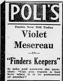 Finders Keepers is a 1921 silent Western film based on a book by Robert Ames Bennett and directed by Otis B. Thayer, starring Edmund Cobb and Violet Mersereau. The film was shot in Denver, Colorado by the Thayer's Art-O-Graf film company.[1][2][3] The film is now considered a lost film.[4]
