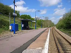 On 5 May 1969 it was renamed "Finstock".[4] The line was singled on 29 November 1971, the former up line now carrying traffic in both directions, and the redundant down platform was removed. By September 1980 the former GWR waiting shelter had been replaced by a simple shelter open on three sides. On 9 March 1987 the former up platform was taken out of use and replaced by one built over the site of the former down line.[7] Evidence of the former up platform and access ramp is now overgrown.[1]
