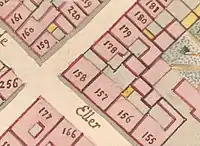 After Friborg's death, the property was passed to Lorenz Schultz, possibly a son from his second wife's first marriage. He continued the grocery business (as urtekræmmer). His property was home to 20 residents in three households at the 1840 census. Lorentz Schultz, a grocer (urtelræmmer), resided on the second floor with his wife Sophie Schultz (née Bernstein), one employee in his grocery business and one lodger (theology student).[12] Elisabeth Hagen (née Hall), widow of a ship captain, resided on the first floor with her three children (aged 20 to 25), her mother Maria Hall (née Phytzner), three lodgers (theology students) and one maid.[13] Niels Christian Bjørn, a captain in the King's Regiment, resided on the ground floor with his wife Gustave Valentin and their five children (aged nine to 23).[14]