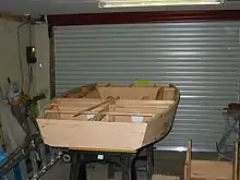 The Firebug is constructed on a rigid jig with 6 timber stringers and a centerline web. The flat bottom is 600 mm wide and is made from 9 mm marine plywood. The sides, bilge panels bulkheads and deck are cut from 2.5 panels of 4 mm marine plywood. The minimum weight of the completed hull is 40 kg[3] (sometimes cited as 27 kg[4]).