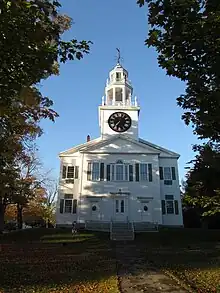 The church is set just south of Belfast's central business district, on a large parcel of land bounded on the northeast by Church Street, the southwest by Court Street, and the southeast by Spring Street. It is set facing Church Street, but well back on the lot, with a grassy lawn dotted with trees in front. The building is a two-story gable-roofed wood frame structure, built largely to a plan published by Asher Benjamin in The Country Builder's Assistant in 1798. Its front facade has a central projecting section with a gabled top, in which three entrance doors are set. The outer two are identical, with flanking pilasters and entablature above, while the central one is a taller double-leaf door with a similar surround. A tower rises astride the main facade and gable, beginning with a square section housing large clock faces. Above this is an open octagonal belfry housing a Revere bell, with Doric columns supporting the next octagonal stage, which supports the cupola and finial. The lower two stages have low balustrades framing their tops, with urn-topped posts at the corners.[2]