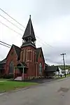The church building is a Victorian Gothic / Queen Anne style, generally square shaped structure completed in 1889 from designs by architects Pierce & Dockstader. It is built of brick over a random ashlar rock faced foundation. It features a tall bell tower and asymmetrically gabled roofline. The interior layout is based upon the Akron plan.[4]