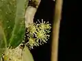 The tree can attain height about 25 m and girth up to 1.7 m. Tree trunk will be covered with sharp stout thorns at its base. Young parts of the tree is hirsute and young leaves are reddish. Leaves are simple and shows alternate phyllotaxy. Petiole is pubescent with a length of 0.3-0.8 cm. Lamina size: 7-15 × 4-8 cm. Leaf shape is elliptic-oblong with acuminate leaf apex and crenate leaf margin. The leaf is 3-nerved at the base with 4-7 pairs of secondary nerves. Flowers are edible ,dioecious, seen in axillary cymes. Fruits are spherical, smooth, scarlet red, with a size of 1-1.5 cm across.[4]