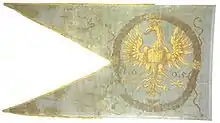 The banner of the Duchy of Teschen, since 1605, remains the oldest preserved image of the ducal flag. The banner was ordered by Duke Adam Wenceslas, who, in 1605, was appointed commander of the Silesian army. As a lynnik of the Habsburgs, he was involved in wars in Hungary and Moravia. The banner was made of blue satin and 160 x 240 cm in size. In the front part, there is a gold-painted eagle of the Duchy of Teschen, and the free part ends with two sharp tongues.[3]